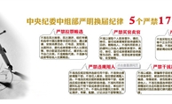 “5個嚴(yán)禁”“17”個不準(zhǔn)”和“5個一律” “5個嚴(yán)禁”: 嚴(yán)禁拉票賄選、嚴(yán)禁買官賣官、嚴(yán)禁跑官要官、嚴(yán)禁違規(guī)用人、嚴(yán)禁干擾換屆“17個不準(zhǔn)”: 1、不準(zhǔn)在民主推薦、民主測評、組織考察和選舉中搞拉票等非組織活動,通過宴請、安排消費活動、打電話、發(fā)短信、當(dāng)面拜訪、委托或者授意中間人出面說情、舉辦聯(lián)誼活動等形
