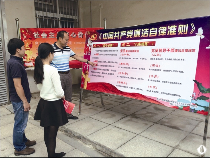 為增強(qiáng)學(xué)習(xí)貫徹的自覺性、主動性,把學(xué)習(xí)貫徹與具體工作實(shí)際結(jié)合起來,公司紀(jì)檢監(jiān)察室在第一時(shí)間進(jìn)行宣傳貫徹。一是以短信形式,向公司全體黨員和中層以上干部發(fā)送2期《廉政知識學(xué)習(xí)卡》短信,并就“妄議中央”、“老鄉(xiāng)會、校友會、戰(zhàn)友會”、“四類人員不得買賣股票”、“社會主義核心價(jià)值觀”等內(nèi)容分4次發(fā)送短信進(jìn)行解讀,以最快捷的方式、最簡潔的字句讓黨員干部及時(shí)了解和知曉《準(zhǔn)則》和《條例》的關(guān)鍵內(nèi)容;二是組織黨委中心組成員集中專題學(xué)習(xí);三是制作四版《準(zhǔn)則》和《條例》宣傳版報(bào),分別布置于二樓、三樓辦公走廊;四是為全體黨員訂購人手一份《中國共產(chǎn)黨廉潔自律準(zhǔn)則、中國共產(chǎn)黨紀(jì)律處分條例、中國共產(chǎn)黨章程》單行本,全部發(fā)放到每一位黨員手中,要求原原本本、逐字逐句認(rèn)真學(xué)習(xí);五是在公司OA信息系統(tǒng)黨務(wù)紀(jì)工團(tuán)門戶發(fā)布通知學(xué)習(xí)。